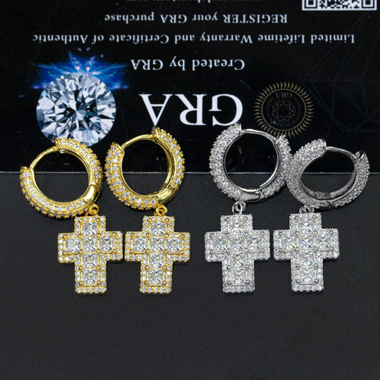 Bubble Letter Silver Moissanite VVS Baguette Cross Eardrop Earring for Men Hip Hop Jewelry