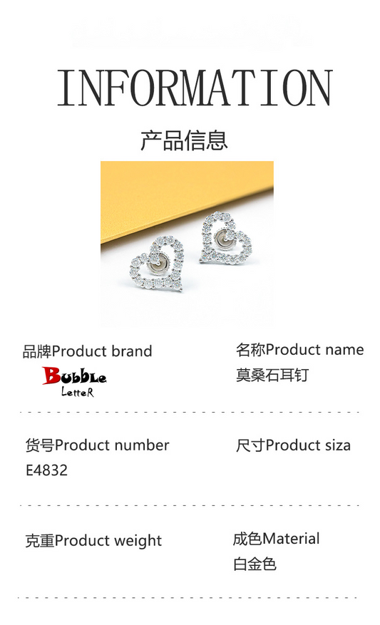 Bubble Letter Silver Moissanite VVS Heart Stud Earring for Women Hip Hop Jewelry