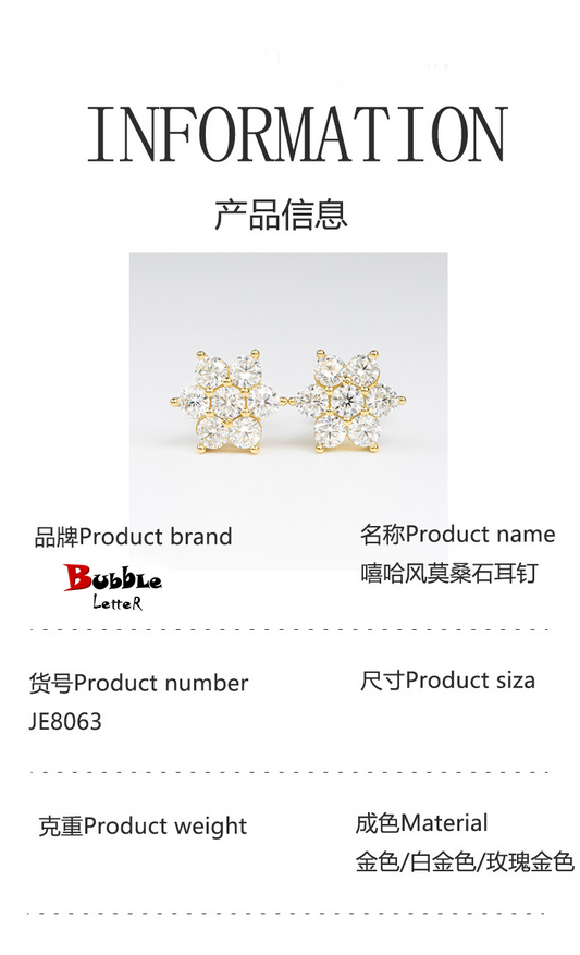 Bubble Letter Silver Moissanite VVS Snowflake Stud Earring for Women Hip Hop Jewelry