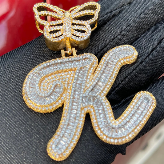 Bubble Letter Initial Necklace for Women Iced Out Baguette Pendant Cursive Prong Setting Butterfly Bail Hip Hop Jewelry