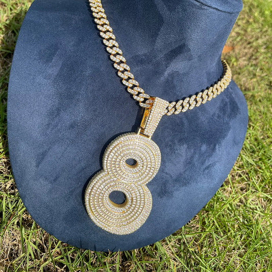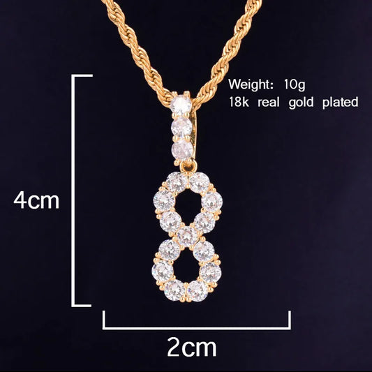 Bubble Letter Iced Out Number 8 Necklace Pendant for Men Prong Setting Real Gold Plated Cubic Zirconia Hip Hop Jewelry