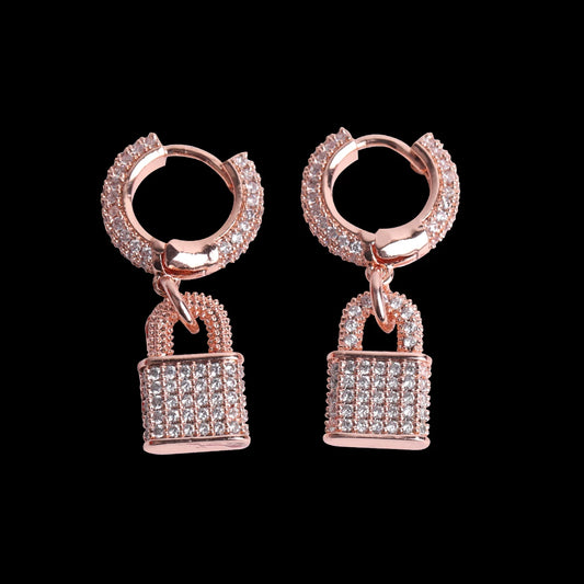 Bubble Letter Lock Stud Earring for Men Iced Out Bling Real Gold Plated Hip Hop Jewelry