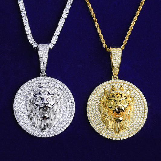Bubble Letter Iced Out Lion King Disc Necklace Pendant for Men 5A Cubic Zirconia Gold Plated Hip Hop Jewelry