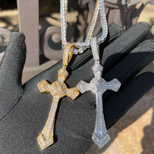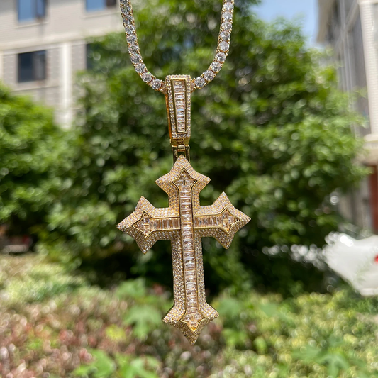 Bubble Letter Iced Out Cross Necklace for Men Baguette Pendant Prong Setting Real Gold Plated Copper Material Hip Hop Jewelry