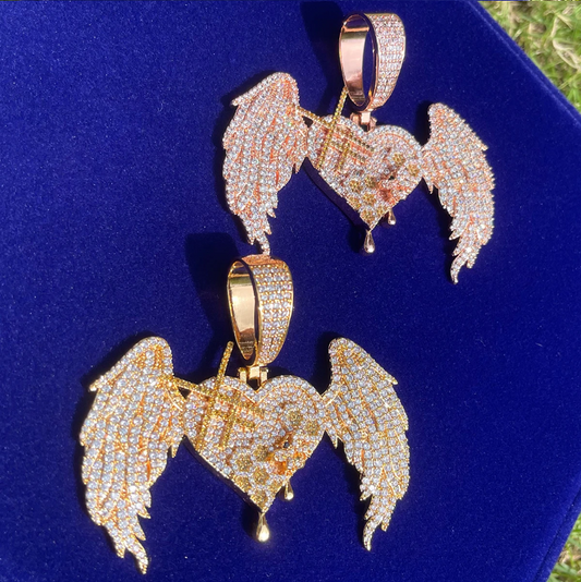 Bubble Letter Iced Out Heart Wings Necklace Pendant for Women Real Gold Plated Cubic Zirconia Hip Hop Jewelry