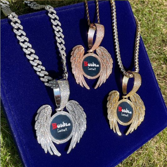 Bubble Letter Iced Out Angle Wing Pendant Necklace for Women Custom Photo Picture Chain Hip Hop Jewelry