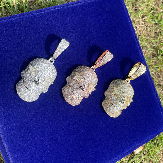 Bubble Letter Iced Out Skull Necklace Pendant for Men Prong Setting Five Stars Eyes Real Copper Cubic Zirconia Hip Hop Jewelry