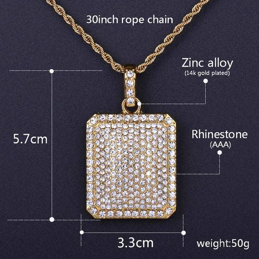Bubble Letter Men Pendant Full Iced Rhinestone Gold Color Charm Square Dog Tag Necklace With Cuban Chain Hip Hop Jewelry