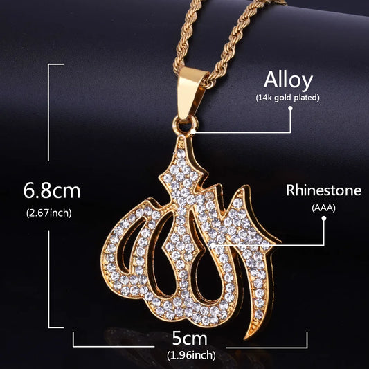 Religious Muslim Jewelry Hip Hop Style Gold Color Bling Crystal Islamic Allah Necklaces & Pendants For Men/Women