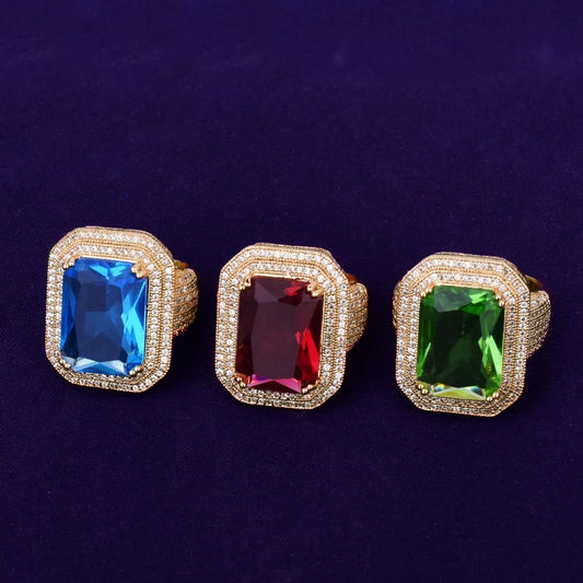 Gold Color Ring with Blue Color stones Cubic Zircon Copper Hip Hop Jewelry 2020 New
