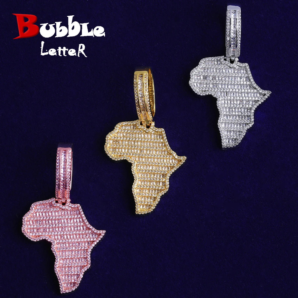 Bubble Letter Iced Out African Map Necklace Pendant for Men Real Gold Plated Cubic Zirconia Hip Hop Jewelry