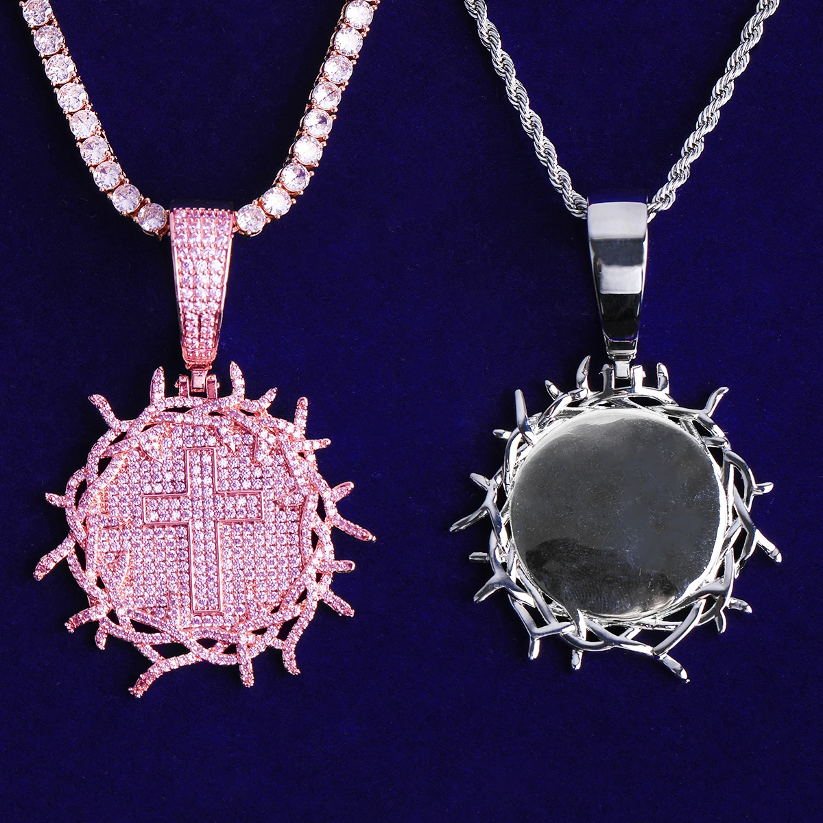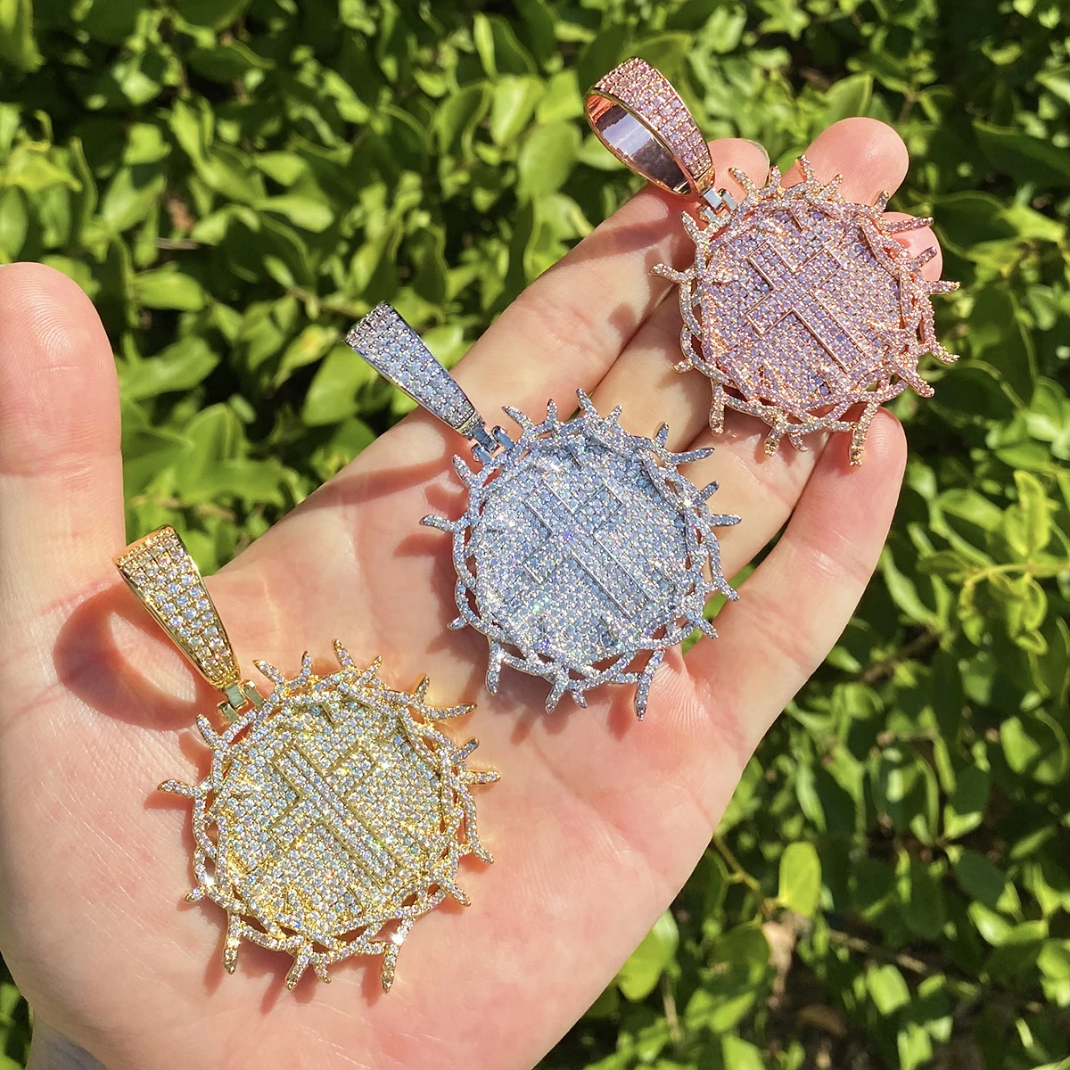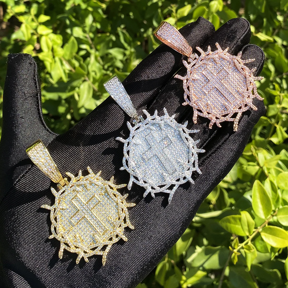 Bubble Letter Iced Out Barbered Wire Circle Cross Necklace Pendant for Men 5A Cubic Zirconia Gold Plated Hip Hop Jewelry