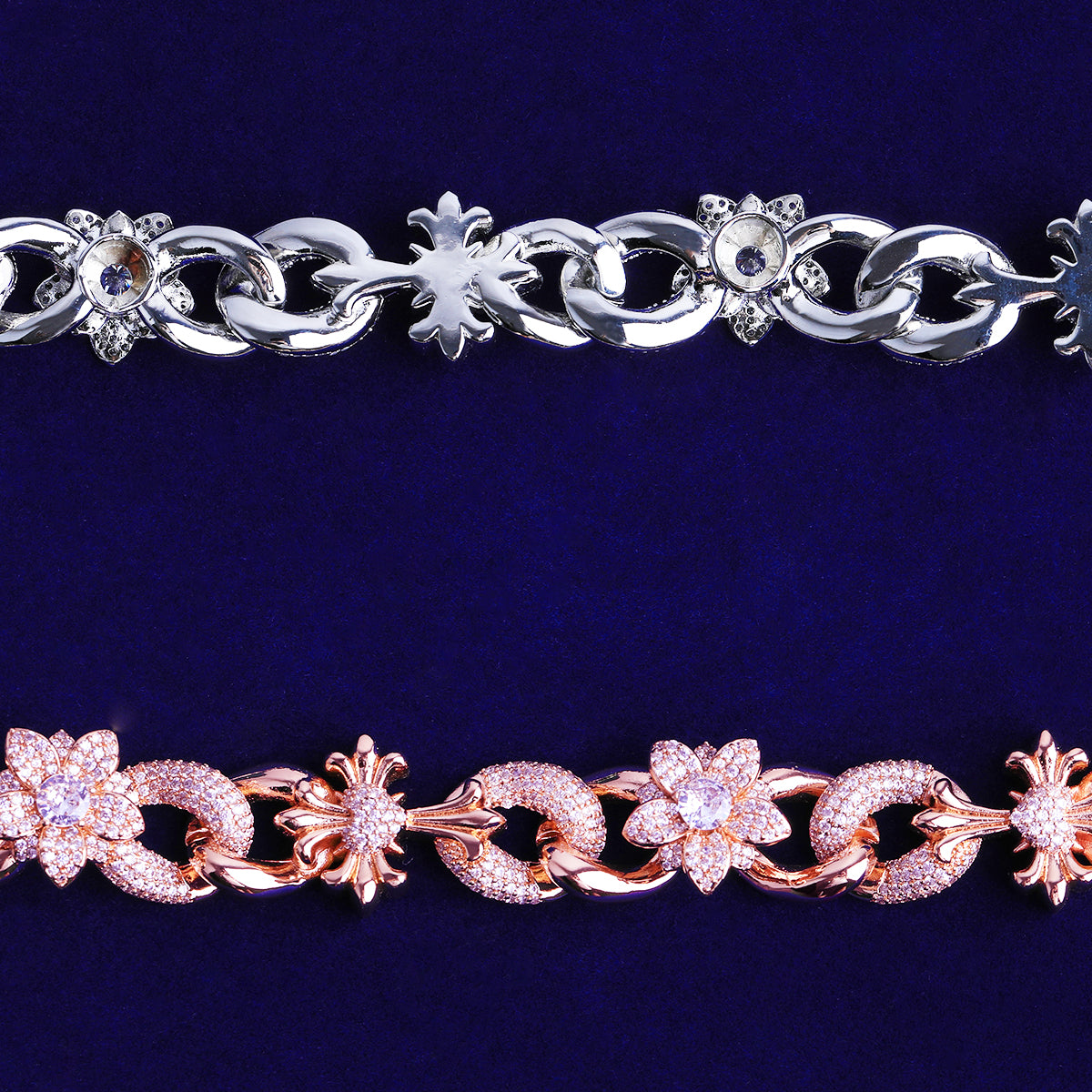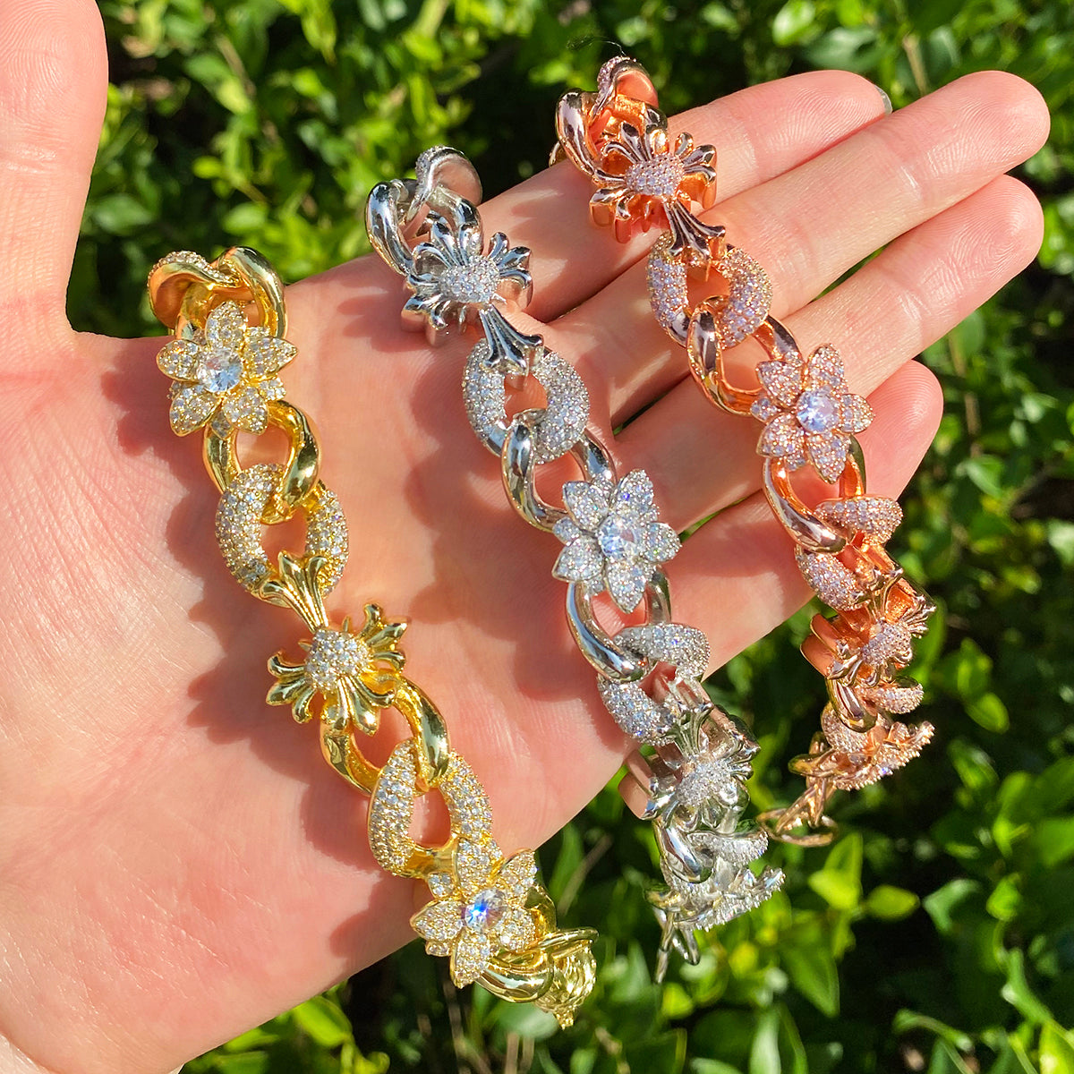 Bubble Letter Iced Out Cross Flower Link Bracelet for Men Real Copper Gold Plated Hip Hop Jewelry