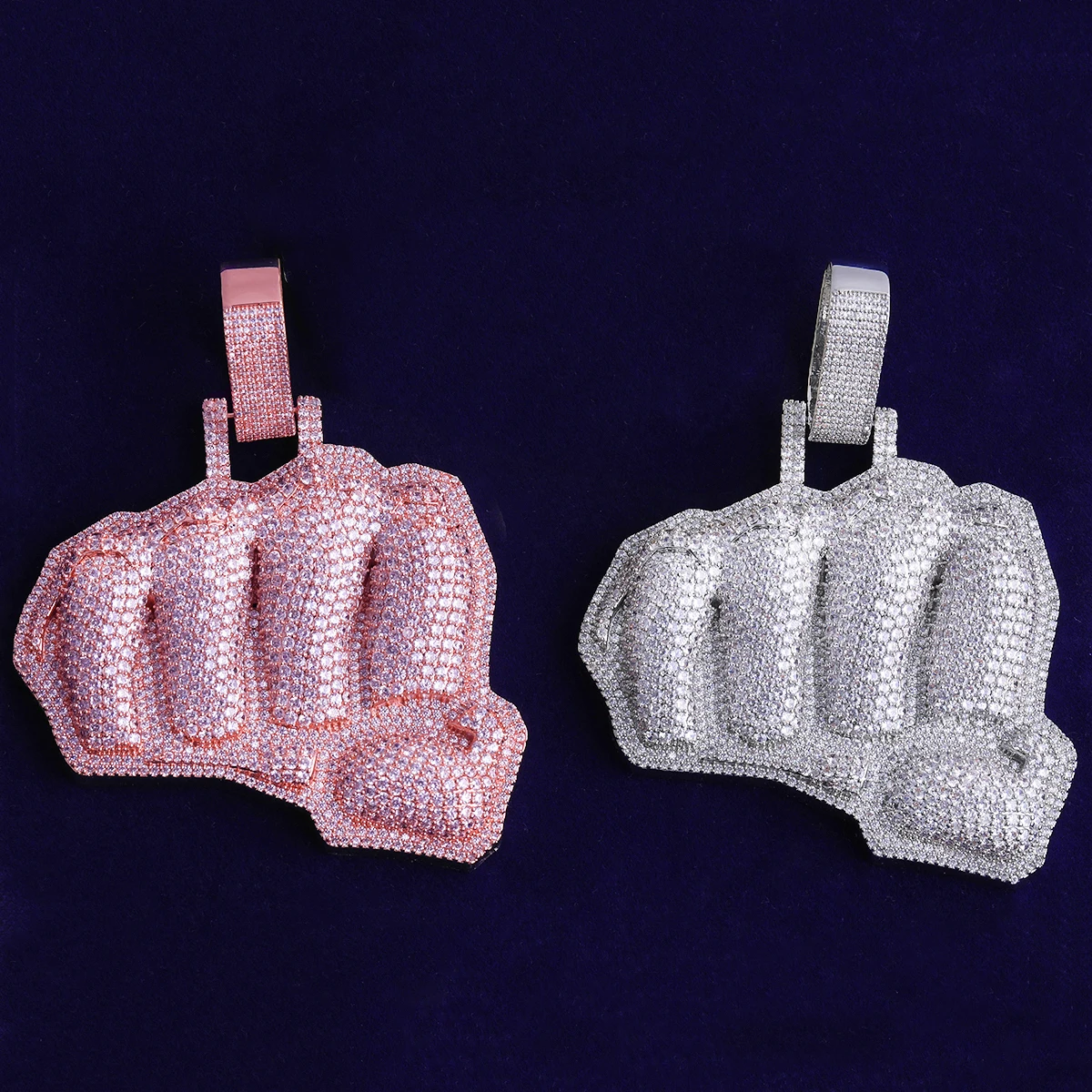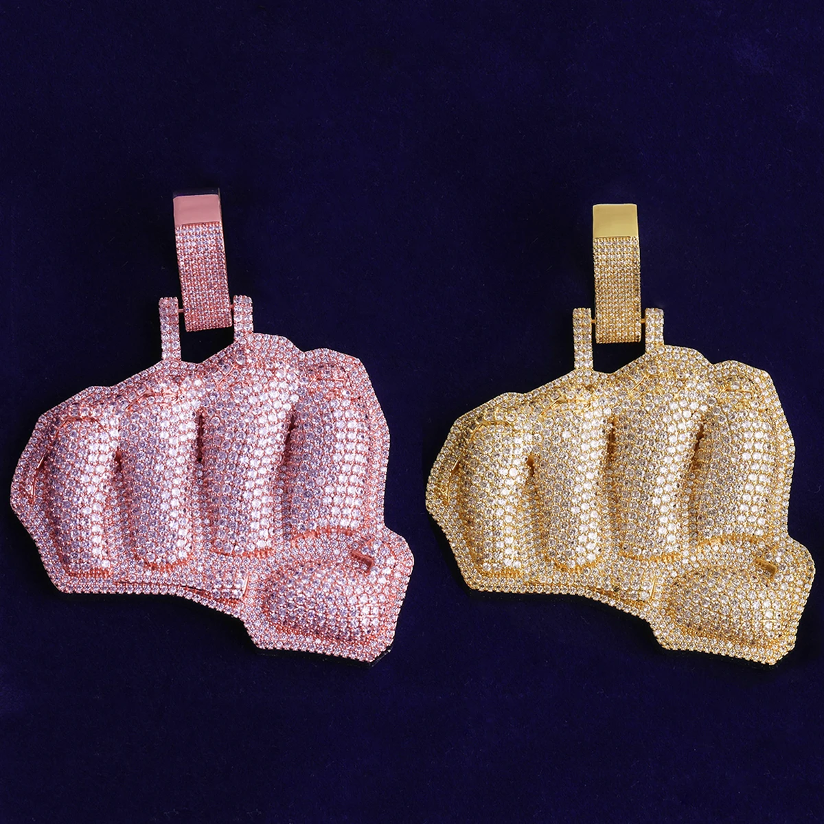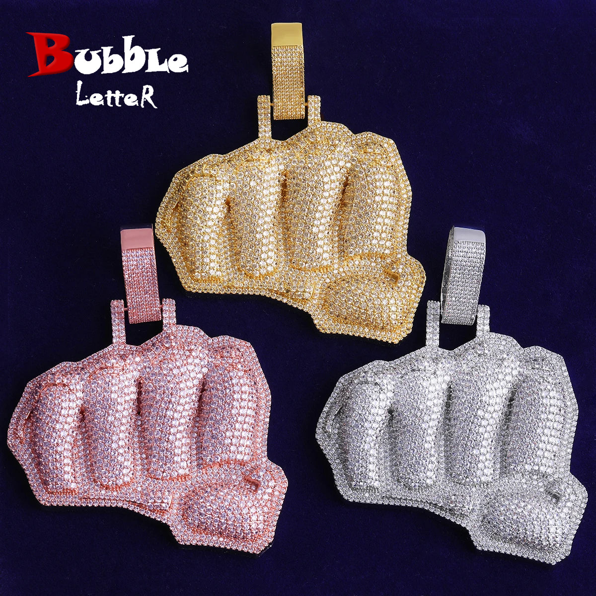 Bubble Letter Iced Out Fist Necklace Pendant for Men Real Gold Plated Cubic Zirconia Hip Hop Jewelry