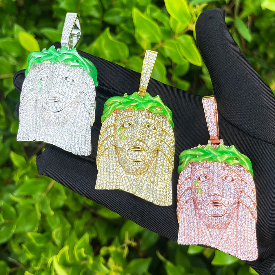 Bubble Letter Iced Out Green Jesus Necklace Pendant for Men 5A Cubic Zirconia Gold Plated Hip Hop Jewelry