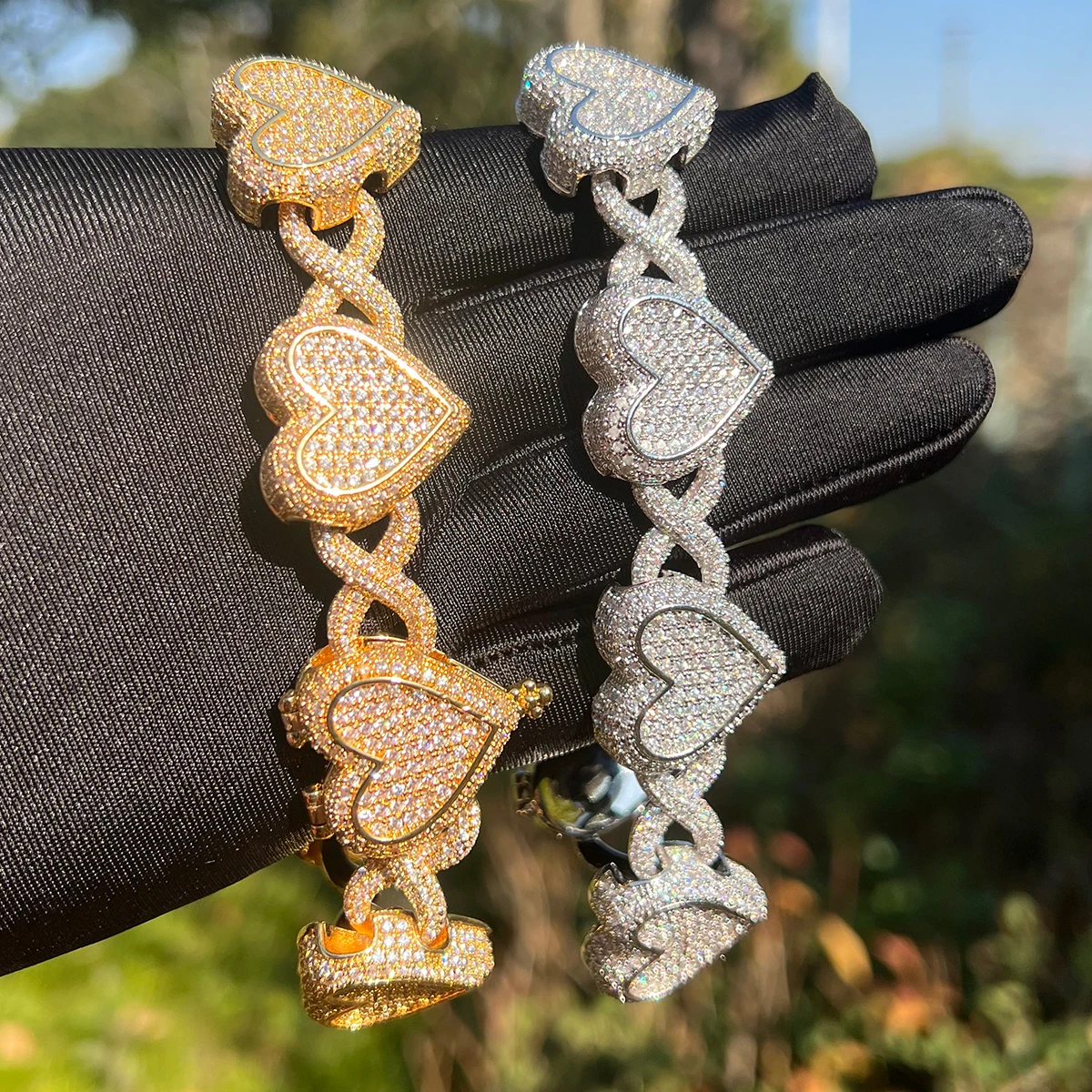 Bubble Letter Iced Out Heart Infinity Cuban Link Bracelet for Women Cubic Zirconia Real Gold Plated Hip Hop Jewelry