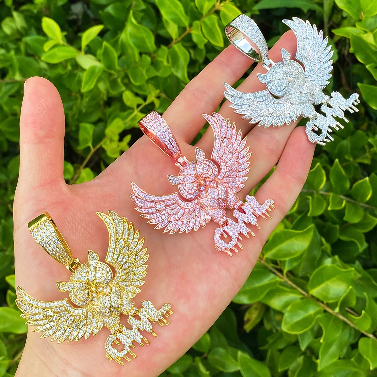 Bubble Letter Iced Out Owl Necklace Pendant for Men 5A Cubic Zirconia Gold Plated Hip Hop Jewelry