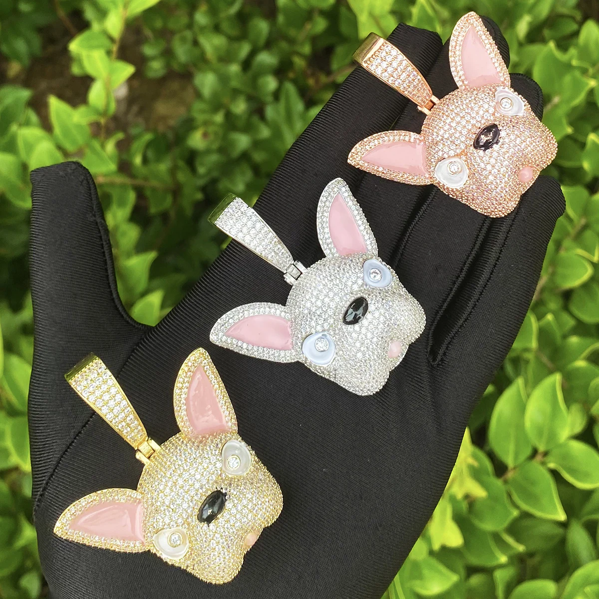 Bubble Letter Iced Out Pink Ears Dog Necklace Pendant for Men Prong Setting 5A Cubic Zirconia Hip Hop Jewelry