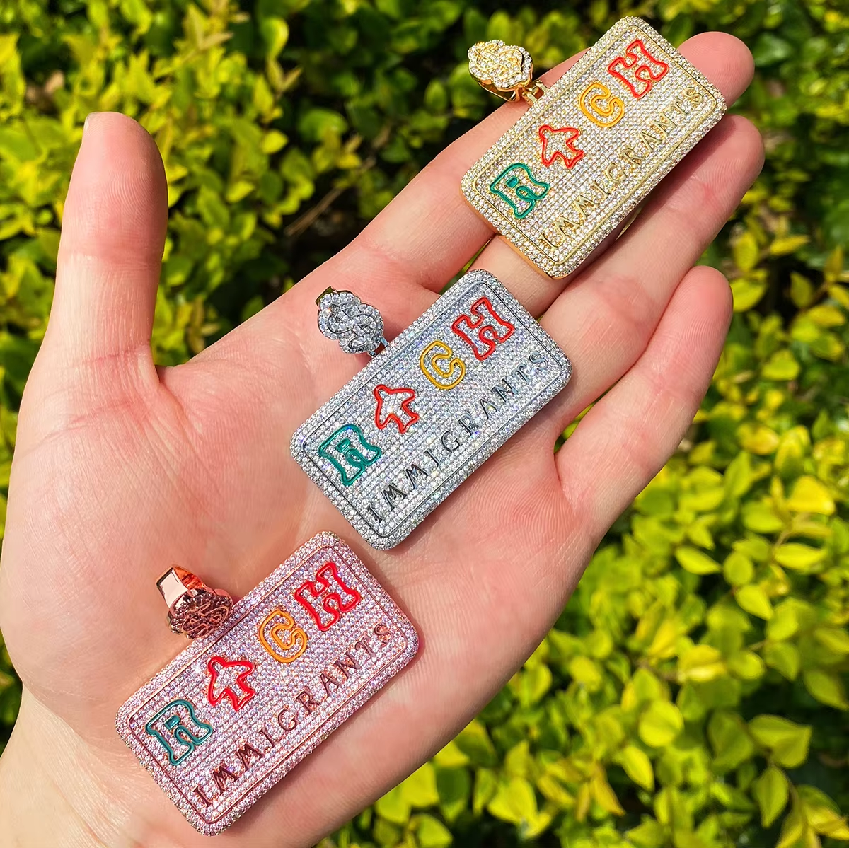 Bubble Letter Iced Out Rich Immigrant Necklace Pendant for Men Real Gold Plated Cubic Zirconia Hip Hop Jewelry
