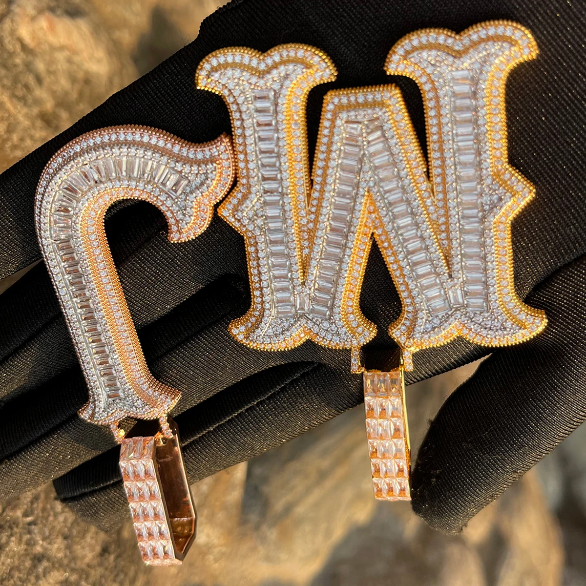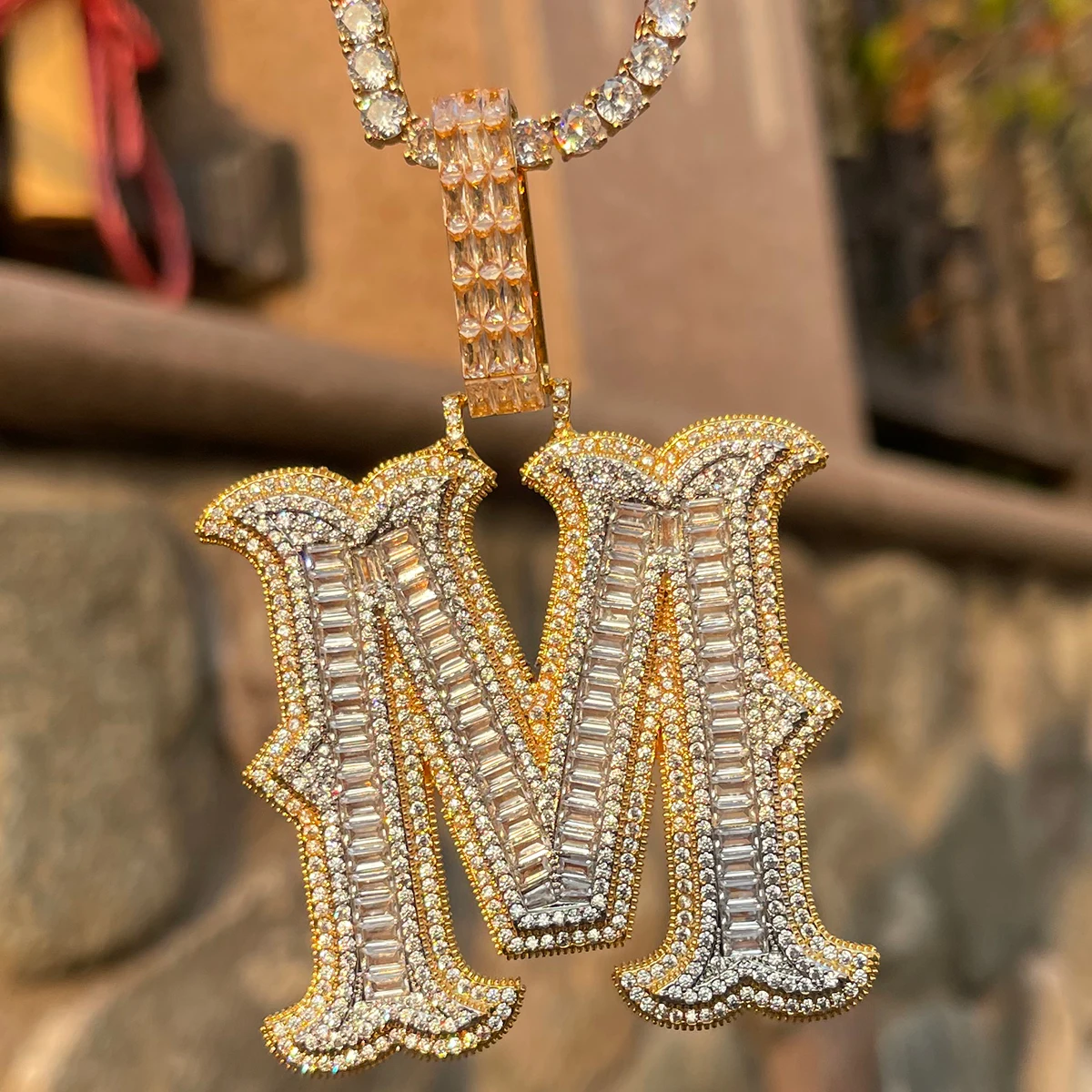 Bubble Letter Initial Necklace Iced Out Pendant Baguette Prong Setting Micro Pave Two Tone Hip Hop Jewelry for Women