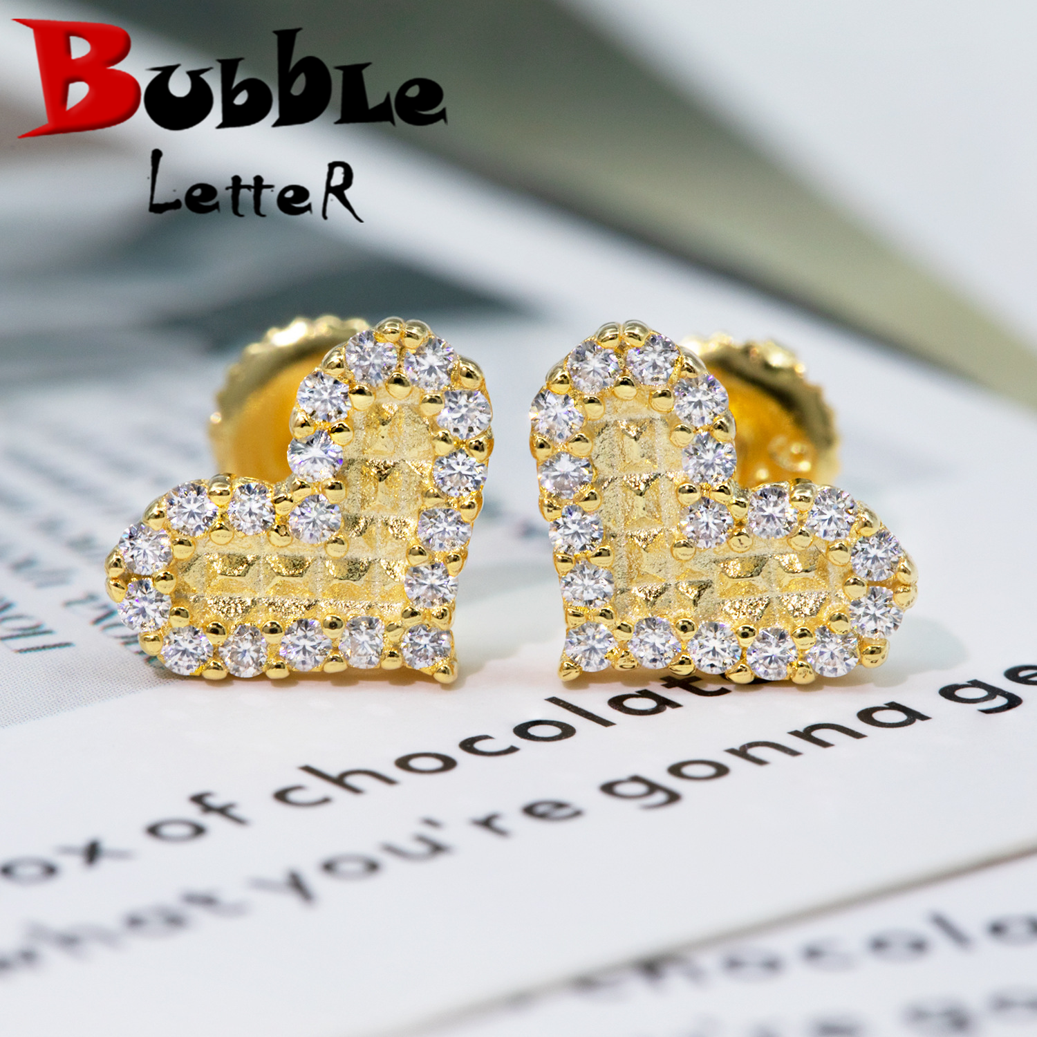 Bubble Letter Silver Moissanite VVS Crooked Heart Stud Earring for Men Hip Hop Jewelry