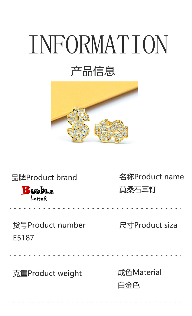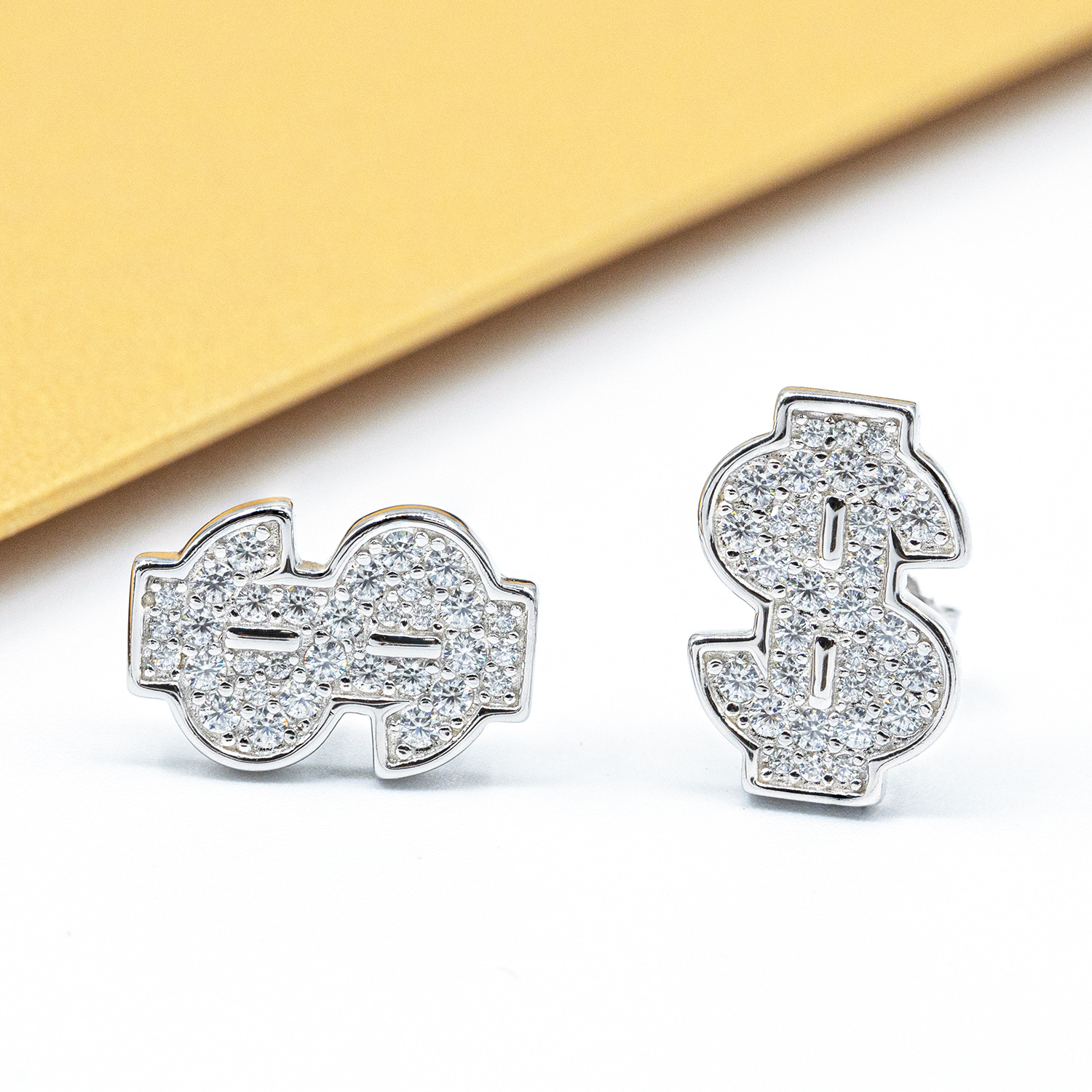 Bubble Letter Silver Moissanite VVS Dollar Sign Stud Earring for Women Hip Hop Jewelry