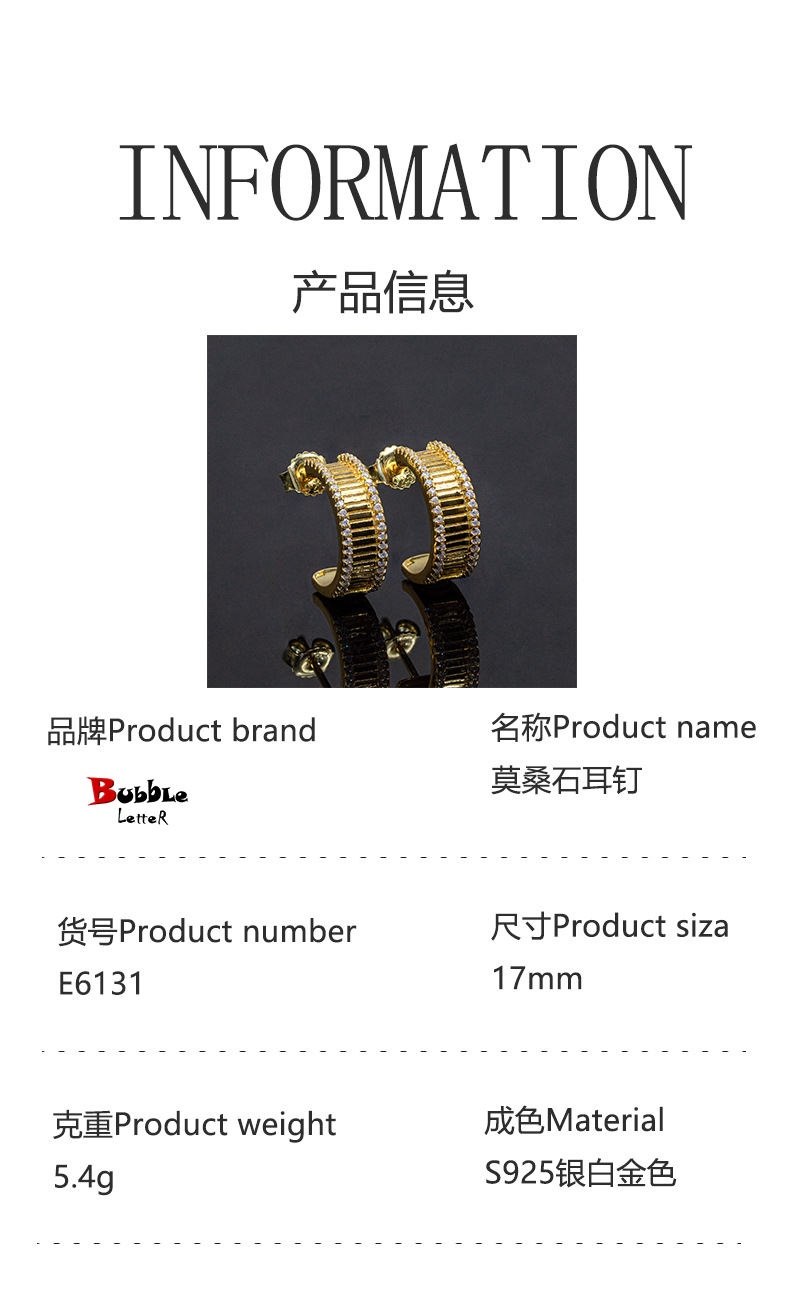 Bubble Letter Silver Moissanite VVS Half Round Stud Earring for Men Hip Hop Jewelry